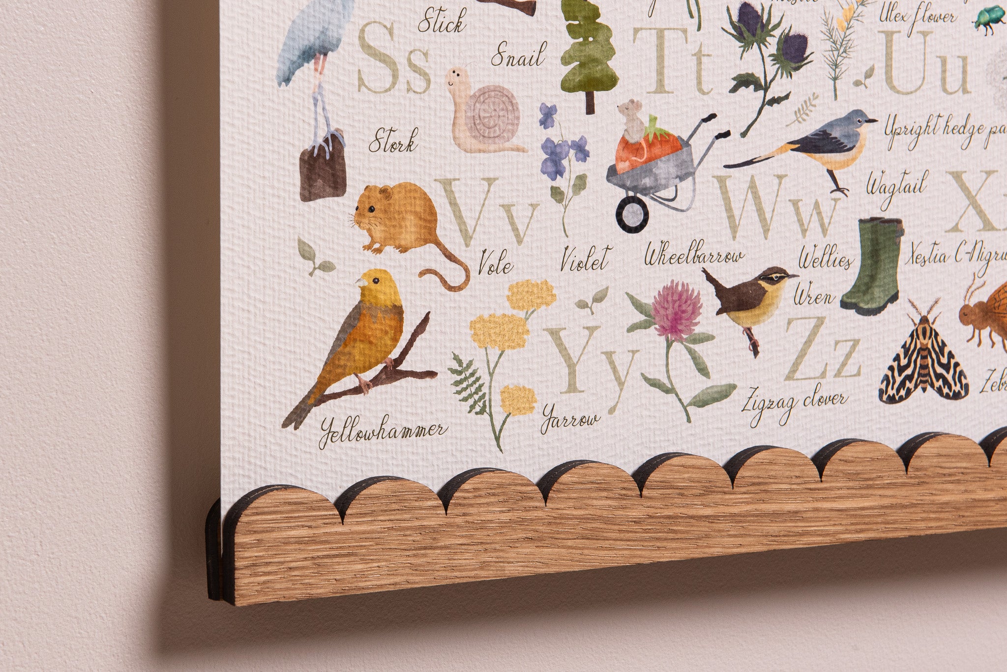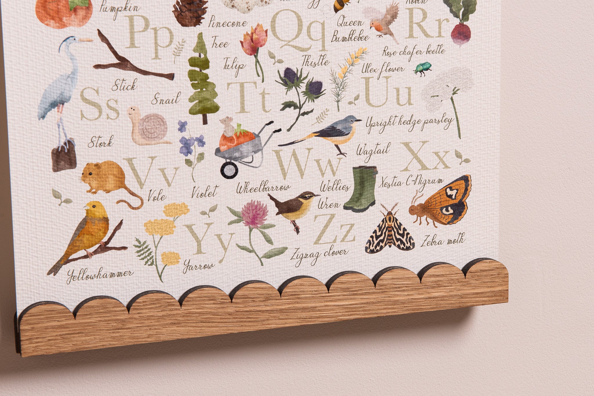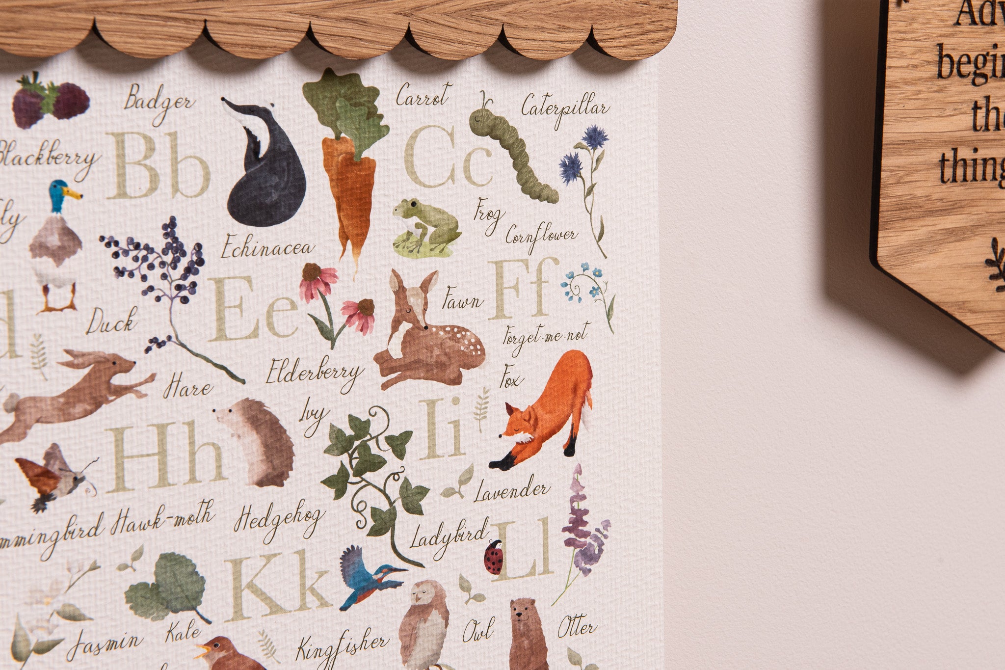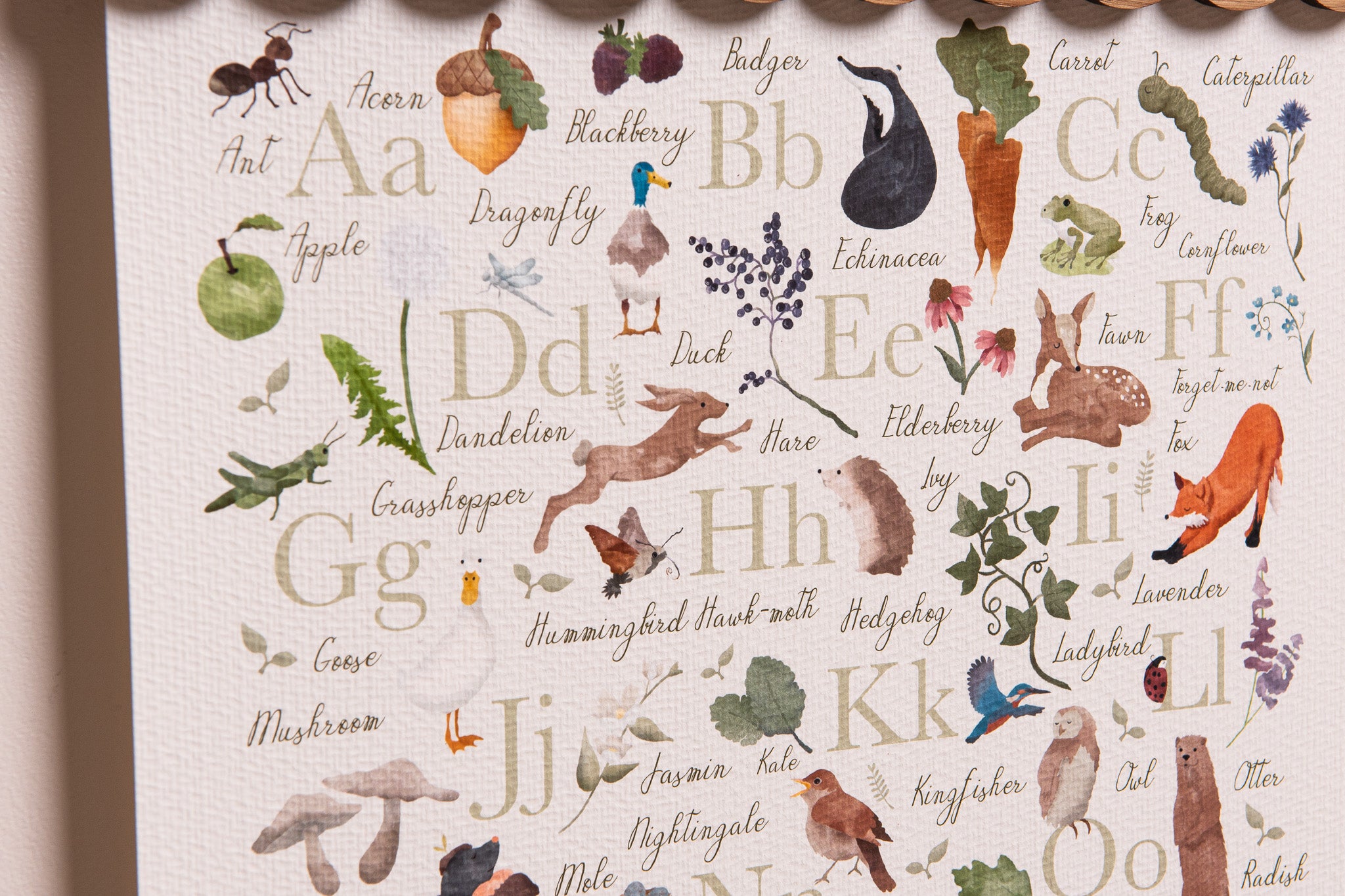 Bring a touch of nature and learning to your child's space with this charming alphabet print. Each letter is beautifully illustrated with native British plants and animals, making it a delightful way for children and adults alike to explore the local flora and fauna.